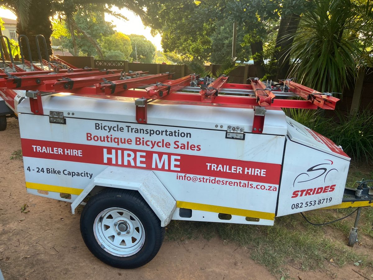 easy rental R60 per day per bikeEasy staright forward configuration options Trailers galore Small, Medium, Large and SUPER 4, 6, 8, 12, 16 and 24. Secure bicycle racks Transport your bicycles without having to remove wheels, adjust handlebars or shift saddle posts Why Choose Us? We offer a unique range of trailers and bicycle capacity options in the market. Located in JHB and the Garden route. Quality trailers custom high capacity trailers maintained and serviced to ensure trouble free rental experience Solution for every need We offer a solution for every bicycle transportation need. You rent, you drive, you transport. You incharge. Excellent Reviews From Customers We Provide New Offers Whole Year Expert Technicians Lifetime Guaranteed Auto Work 4 to 8 Luggage trailer 5, 6 or 7 foot 12 and 16 High capacity luggage space 16 High capacity no luggage space Monster 24 bike no luggage space CONTACTS US NOW TO SECURE YOUR BOOKING info@stridesrentals.co.za